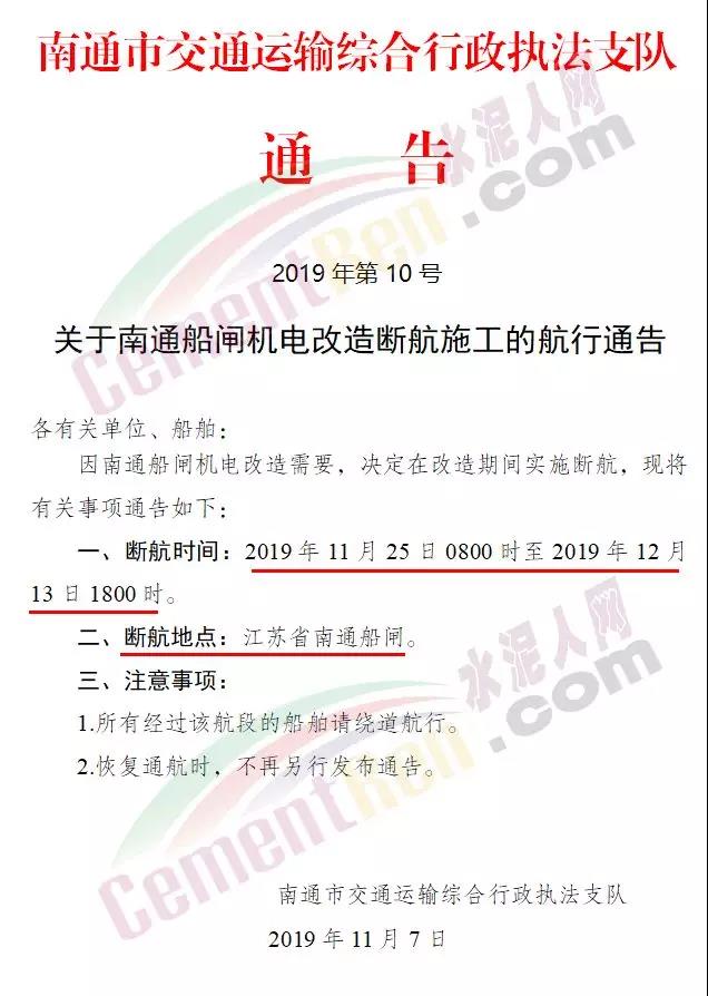 上个月南通市交通运输综合行政执法支队发布《关于南通船闸机电改造断航施工的航行通告》(2019年第10号)称因南通船闸机电改造需要,决定在改造期间实施断航。断航时间11月25日8时至12月13日18时。断航地址为江苏省南通船闸。要求所有经过该航段的船舶绕道航行。
