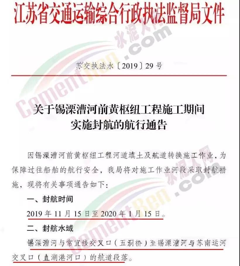 江苏省交通运输综合行政执法监督局发布《关于锡溧漕河前黄枢纽工程施工期间实施封航的航行通告》(苏交执法水〔2019〕29 号)。锡溧漕河前黄枢纽工程河道填土及航道封航时间为2019 年 11 月 15 日至 2020 年 1 月 15 日。封航水域为锡溧漕河与常宜线交叉口(五洞桥)至锡溧漕河与苏南运河交叉口(直湖港河口)的航道段落。封航期间途经船舶必须从芜申运河、丹金溧漕河、京杭运河绕行,同时禁止300吨以上、船宽7米以上的船舶通过武宜运河、老锡溧漕河(太滆运河)绕行。