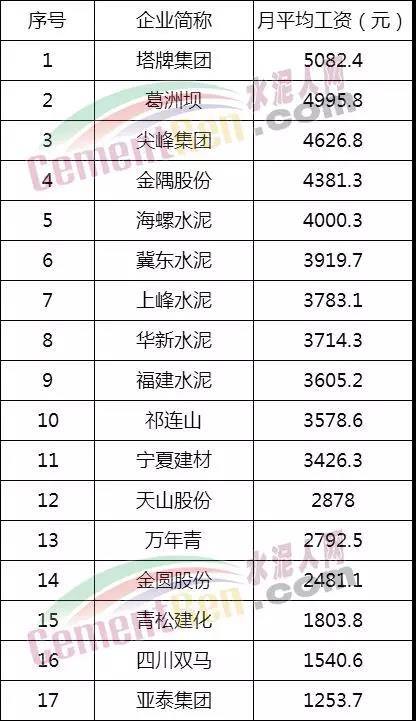 水泥企业员工月平均工资排行榜