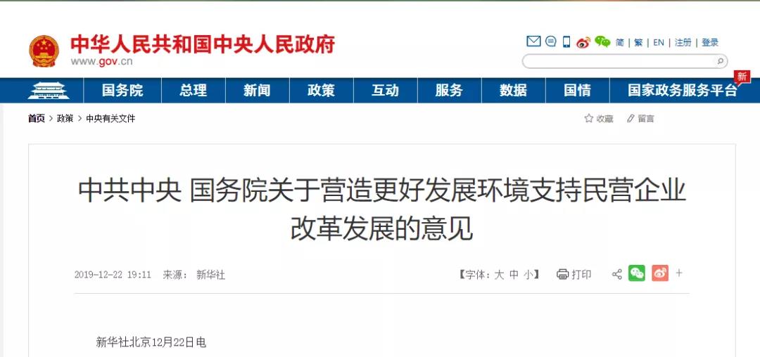 日前,中华人民共和国中央人民政府官网发布《中共中央 国务院关于营造更好发展环境 支持民营企业改革发展的意见》称:改革开放40多年来,民营企业在推动发展、促进创新、增加就业、改善民生和扩大开放等方面发挥了不可替代的作用。民营经济已经成为我国公有制为主体多种所有制经济共同发展的重要组成部分。为进一步激发民营企业活力和创造力,充分发挥民营经济在推进供给侧结构性改革、推动高质量发展、建设现代化经济体系中的重要作用,现就营造更好发展环境支持民营企业改革发展提出如下意见。