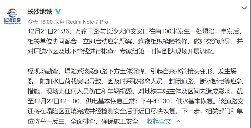 昨日(22日)18长沙地铁通报12月21日21:36,万家丽路与长沙大道交叉口往南100米发生一处塌陷。事发后,相关单位协同配合,立即启动应急预案,连夜组织抢险抢修、做好交通疏导,并对周边小区及地下管线进行排查;专家组第一时间到达现场开展调查。
