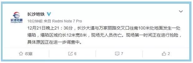 12月21日23时50分,长沙地铁官方微博通报称,当日21时36分,长沙大道与万家丽路交叉口往南100米处地面发生一处塌陷,塌陷区域约长12米宽8米,现场无人员伤亡。现场第一时间正在进行抢险,具体原因正在进一步调查中。