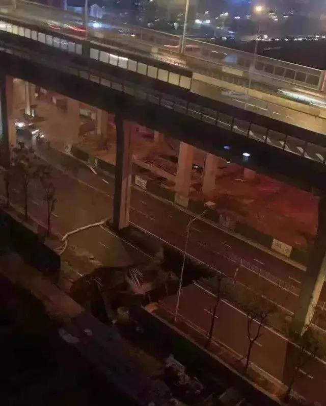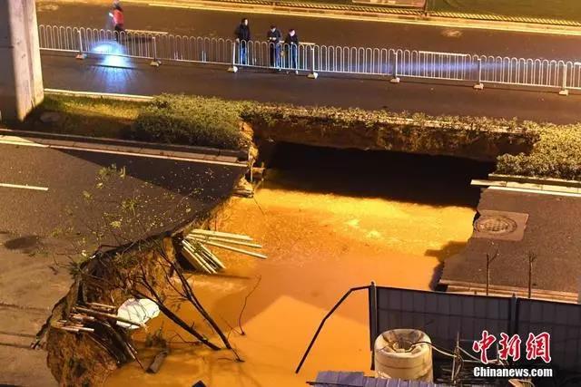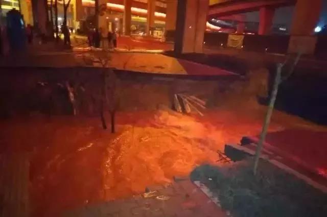 塌陷路面位于高架桥下,塌陷宽度有数米宽,塌陷区内有管道向外涌水,且水位不断上升。