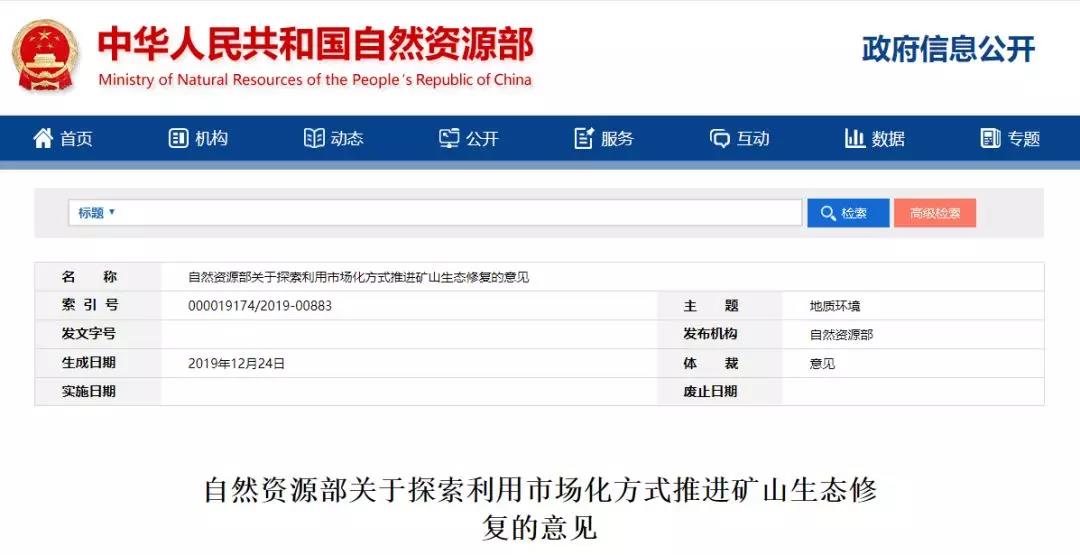 日前,自然资源部发布《关于探索利用市场化方式推进矿山生态修复的意见》(以下简称“《意见》”)称,为解决矿山生态修复历史欠账多、现实矛盾多、投入不足等突出问题,按照党的十九大“构建政府为主导、企业为主体、社会组织和公众共同参与的环境治理体系”的要求,坚持“谁破坏、谁治理”“谁修复、谁受益”原则,通过政策激励,吸引各方投入,推行市场化运作、科学化治理的模式,加快推进矿山生态修复,制定本意见。