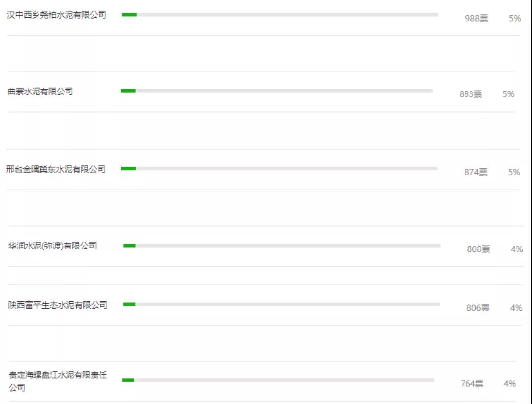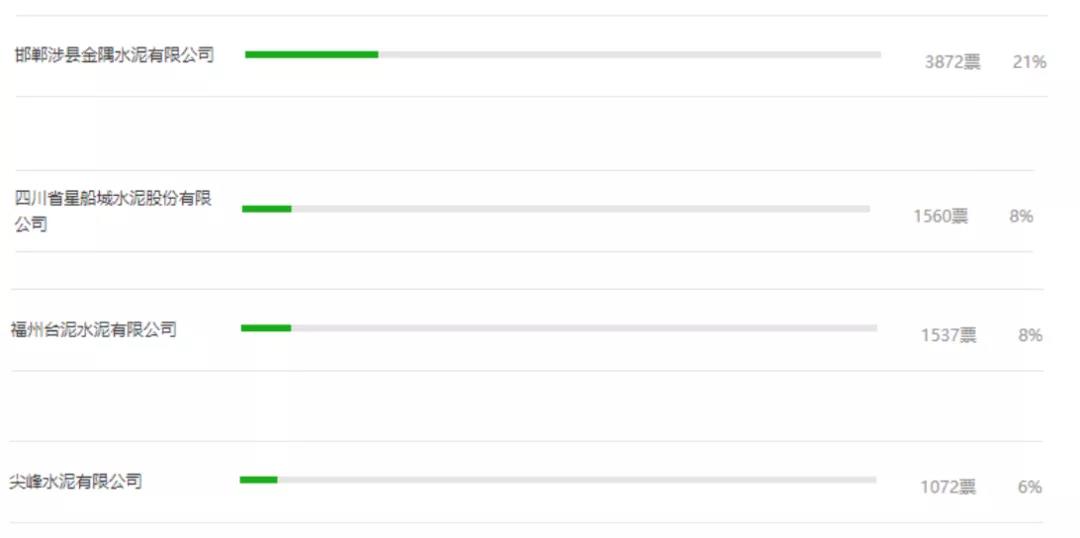 一、邯郸涉县金隅水泥3872票。二、四川星船城水泥股份有限公司1560票。三、福州台泥水泥有限公司位居前三位1537票。四、尖峰水泥1072票。五、汉中西乡尧柏水泥有限公司988票。六、曲寨水泥有限公司883票。七、邢台金隅冀东水泥有限公司874票。八、华润水泥(弥渡)有限公司808票。九、陕西富平生态水泥有限公司806票。十、贵定海螺盘江水泥有限责任公司764票。