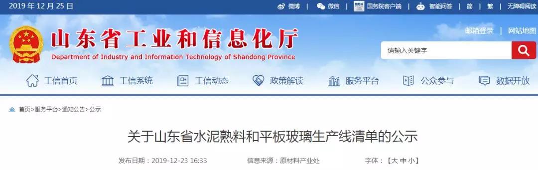 根据工业和信息化部办公厅和国家发展改革委办公厅《关于严肃产能置换水泥平板玻璃行业新增产能的通知》(工信厅联原〔2018〕57号)及工信部《关于更新并公开水泥平板玻璃生产线清单的函》(工原函〔2019〕527号)有关要求,经汇总并组织专家审核各市工业和信息化主管部门报送的水泥熟料和平板玻璃生产线清单和相关资料,结合2018年公告的水泥玻璃产能情况,形成更新后的全省水泥熟料和平板玻璃生产线清单。现将截止2018年12月31日的山东省水泥熟料和平板玻璃生产线清单予以公示,公示期时间自2019年12月23日至12月28日。如有异议,请在公示时间内向山东省工信厅反映。