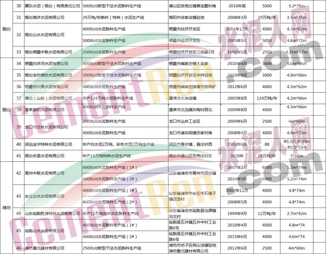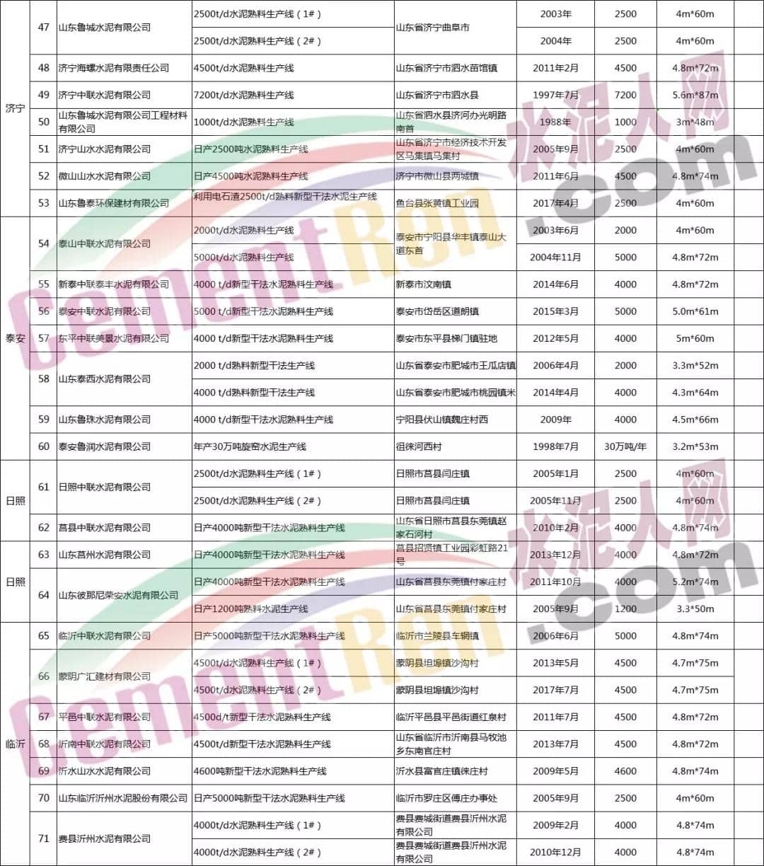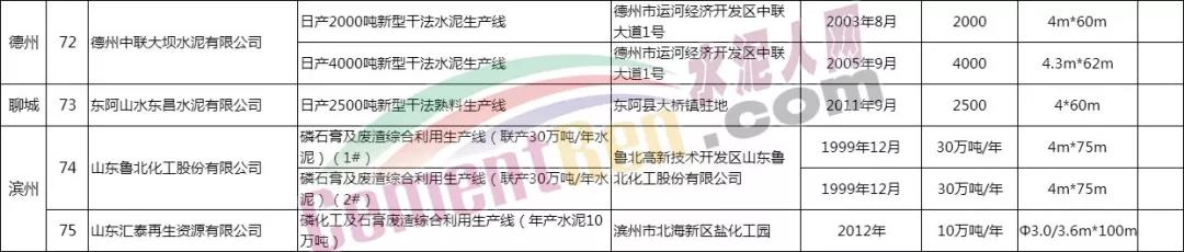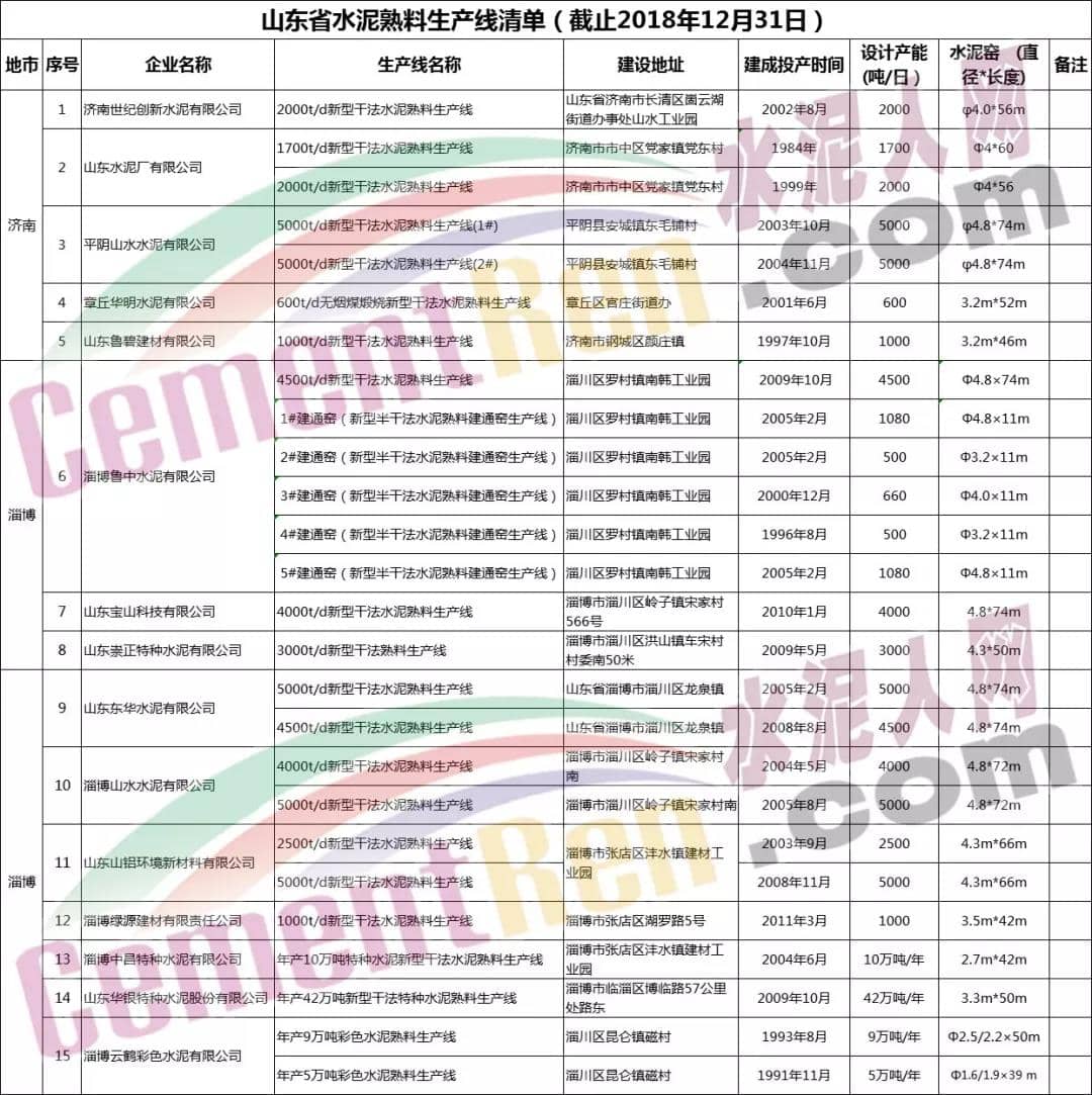 12月23日,山东省工业和信息化厅发布了《关于山东省水泥熟料和平板玻璃生产线清单的公示》,截止2018年12月31日山东省水泥熟料生产线共计75条水泥熟料生产线。其中5000t/d(含)以上生产线共18条,4000t/d(含)以上生产线共35条,2500-3000吨t/d生产线共22条。公示全文如下: