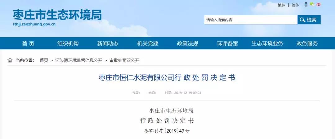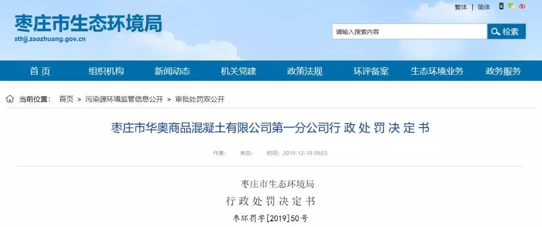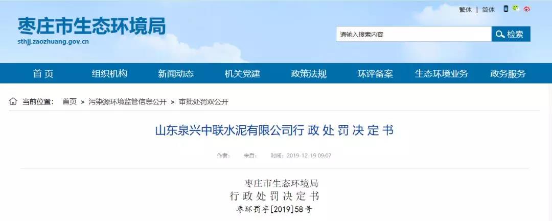 日前,枣庄市生态环境局发布了多份行政处罚决定书,其中有山东泉兴中联水泥有限公司、枣庄市恒仁水泥有限公司、枣庄市华奥商品混凝土有限公司等8家企业因环境污染被处罚,累计罚款共81.5万元。