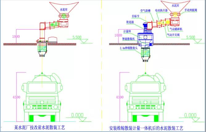 如下图案例所示,水泥出料口到散装机法兰高度低于0.5米,目前大部分散装平台高度在5.5m以上,散装罐车多数在4.3m以下。所有通过式散装计量设备至少要求斜槽出料口到散装机法兰高度在1m以上。我公司将传统平台安装的散装机改为可以灵活布置的新型散装机,并利用原有散装机的高度和散装平台下方高度来完成定量散装的技术改造。