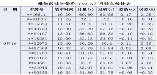 维鲸散装计量秤目前已在水泥生产企业中有多个应用案例,取得良好的应用效果,以2019在安徽某水泥生产企业的实测数据记录为例,可以看出使用该系统后的计量精度均保持在1%以内,在一个月内无返车打料或加装的现象,完全可达到一次装车完成无超载出厂的情况。