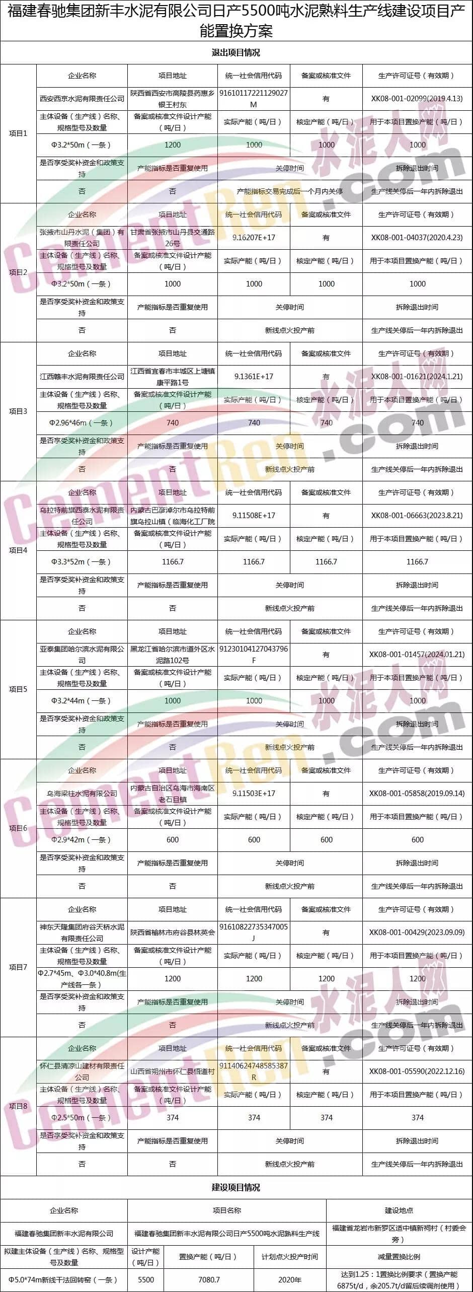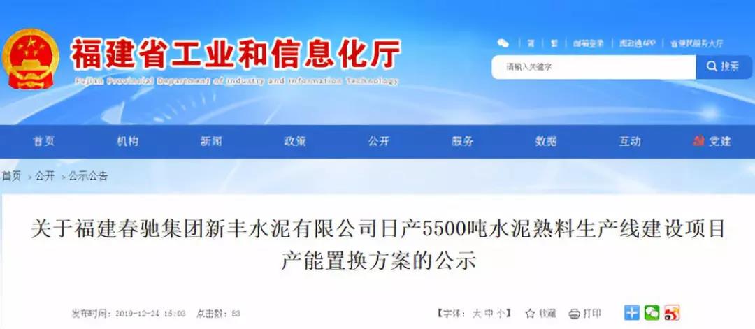 12月24日,福建省工业信息化厅发布了《关于福建春驰集团新丰水泥有限公司日产5500吨水泥熟料生产线建设项目产能置换方案的公示》,原文如下: