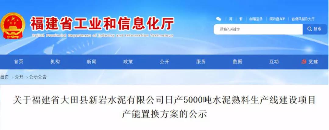 同期,福建省工业和信息化厅发布了《关于福建省大田县新岩水泥有限公司日产5000吨水泥熟料生产线建设项目产能置换的公示》,原文如下: