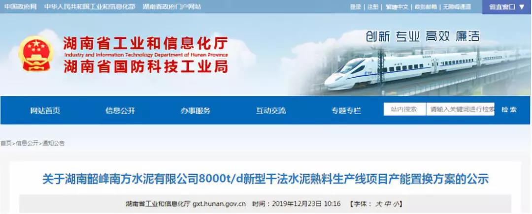 12月23日,湖南省工业和信息化厅发布了《关于湖南韶峰南方水泥有限公司8000t/d新型干法水泥熟料生产线项目产能置换方案的公示》,原文如下: