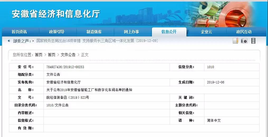 为加快智能制造发展,推进制造强省建设,推动我省制造业高质量发展,根据《关于印发安徽省智能工厂和数字化车间认定管理暂行办法的通知》(皖经信装备〔2017〕181号)和《关于开展2019年支持制造强省建设若干政策和大力促进民营经济发展若干意见相关项目申报工作的通知》(皖经信财务〔2019〕136号)要求,经申报、核查、评审、比对、公示等环节,确定2019年安徽省智能工厂20个和数字化车间100个,现将名单(见附件)予以公布。