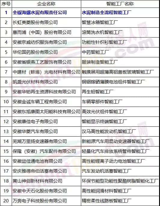 日前,安徽省工业和信息化厅发布了《关于公布2019年安徽省智能工厂和数字化车间名单的通知》称为加快智能制造发展,推进制造强省建设,推动我省制造业高质量发展,根据《关于印发安徽省智能工厂和数字化车间认定管理暂行办法的通知》(皖经信装备〔2017〕181号)和《关于开展2019年支持制造强省建设若干政策和大力促进民营经济发展若干意见相关项目申报工作的通知》(皖经信财务〔2019〕136号)要求,经申报、核查、评审、比对、公示等环节,确定2019年安徽省智能工厂20个,其中包括海螺集团旗下全椒海螺水泥有限责任公司水泥制造全流程智能工厂。通知全文如下: