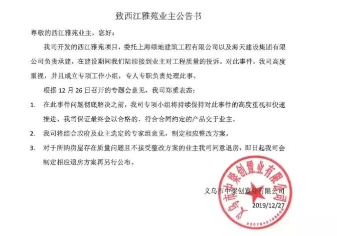在公告书中,中梁创置业称,公司开发的西江雅苑项目,委托上海绿地建筑工程有限公司以及海天建设集团有限公司负责承建,在建设期间陆续接到业主对工程质量的投诉。对此事件,公司高度重视,并且成立专项工作小组,专人专职负责处理此事。