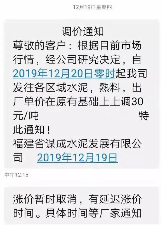 12月19日,福建谋成水泥发展有限公司通知,根据市场情况,经公司研究决定自20日零时起发区域的水泥及熟料出厂价上调30元/吨,同日午间,又发通知称涨价暂时延期。