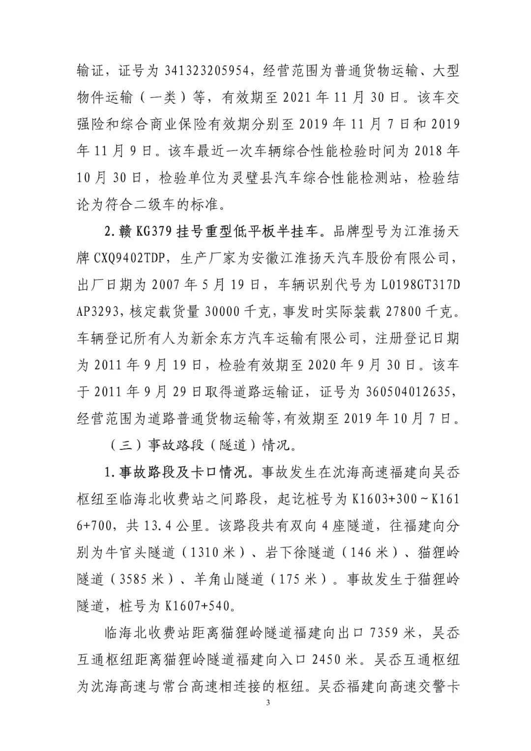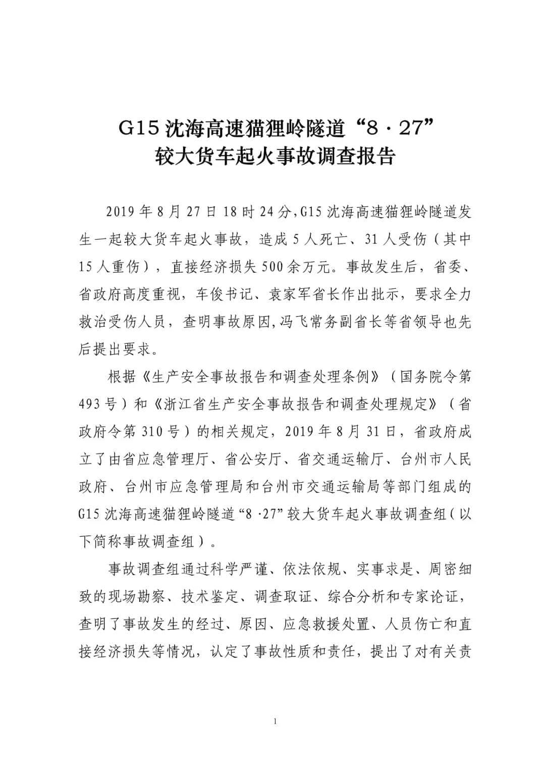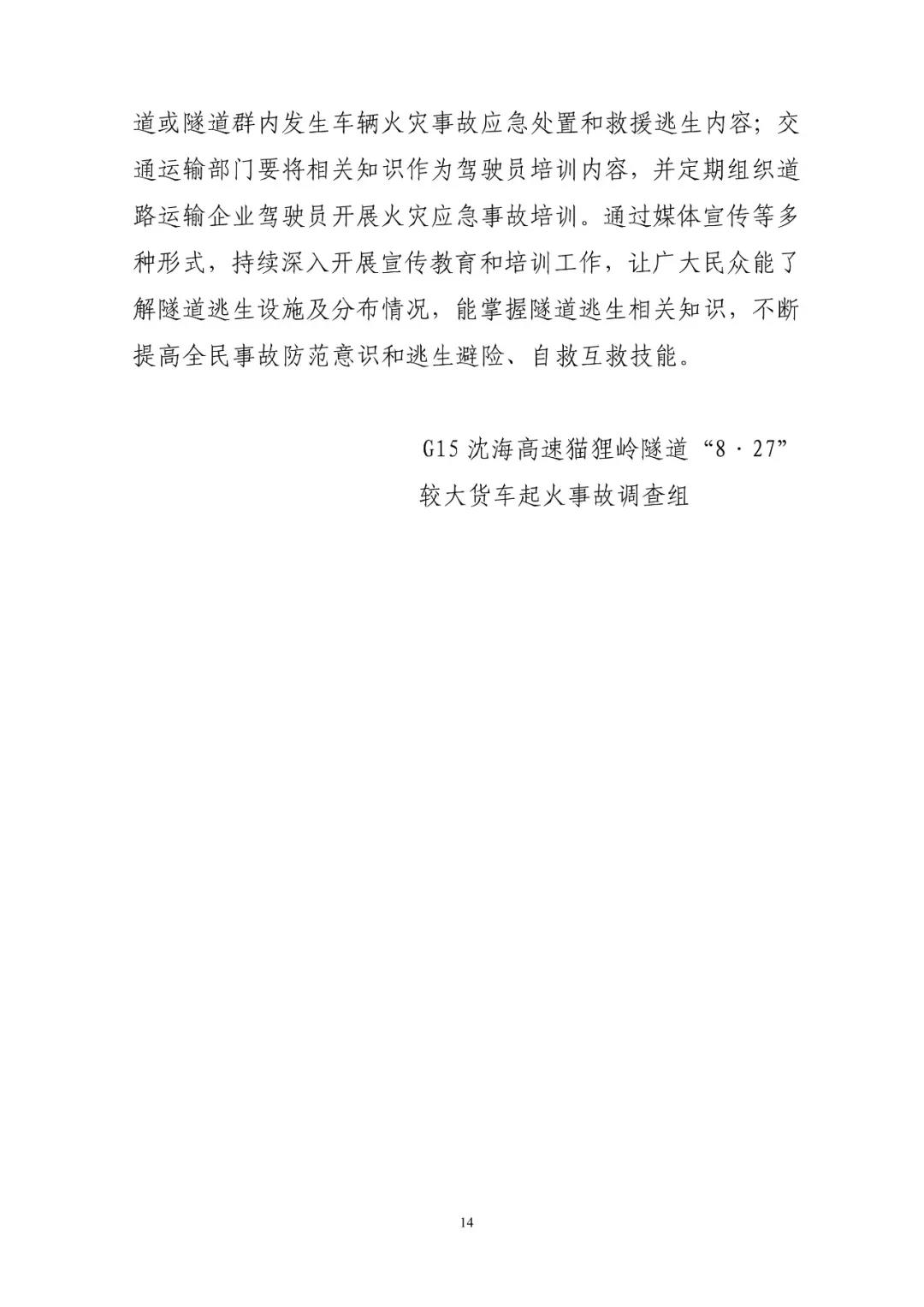 G15沈海高速猫狸岭“8.27”较大货车起火事故调查报告