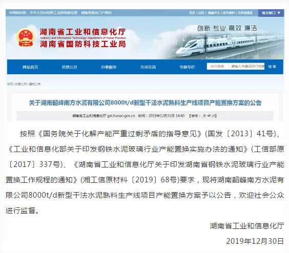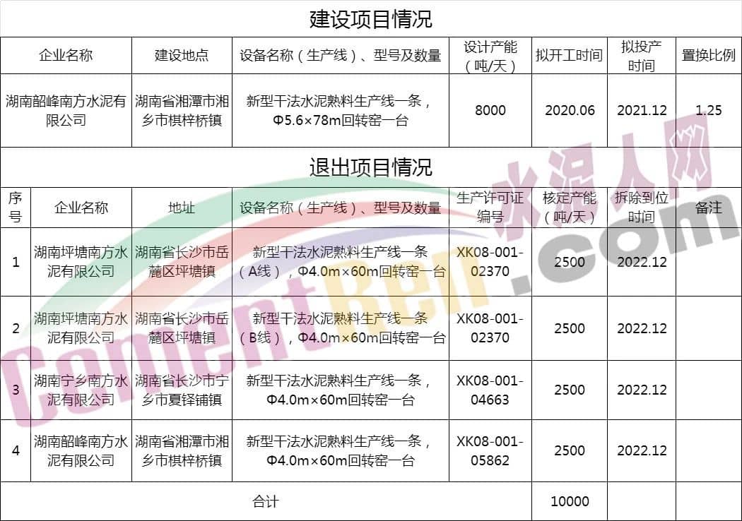 昨日(12月31日),湖南省工业和信息化厅发布了《关于湖南韶峰南方水泥有限公司8000t/d新型干法水泥熟料生产线项目产能置换方案的公告》,原文如下: 产能置换方案如下: 上述方案显示,湖南韶峰南方水泥有限公司将在湖南省湘潭市湘乡市棋梓桥镇拟建一条日产8000吨熟料生产线(Φ5.6×78m回转窑),拟2020年6月开工,2021年12月投产。