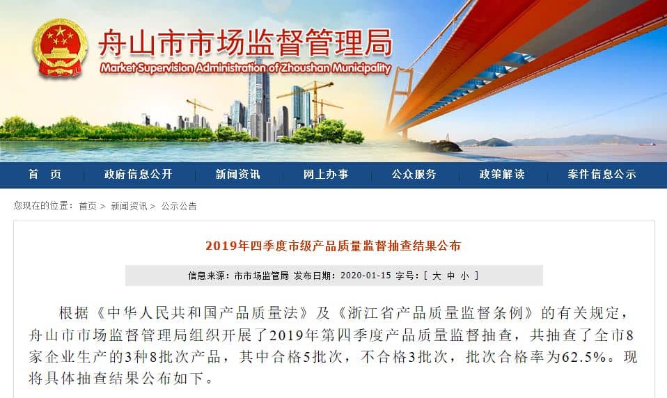 日前,浙江省舟山市市场监督管理局网站公布2019年四季度市级产品质量监督抽查结果,共抽查了全市8家企业生产的3种8批次产品,其中合格5批次,不合格3批次,批次合格率为62.5%。