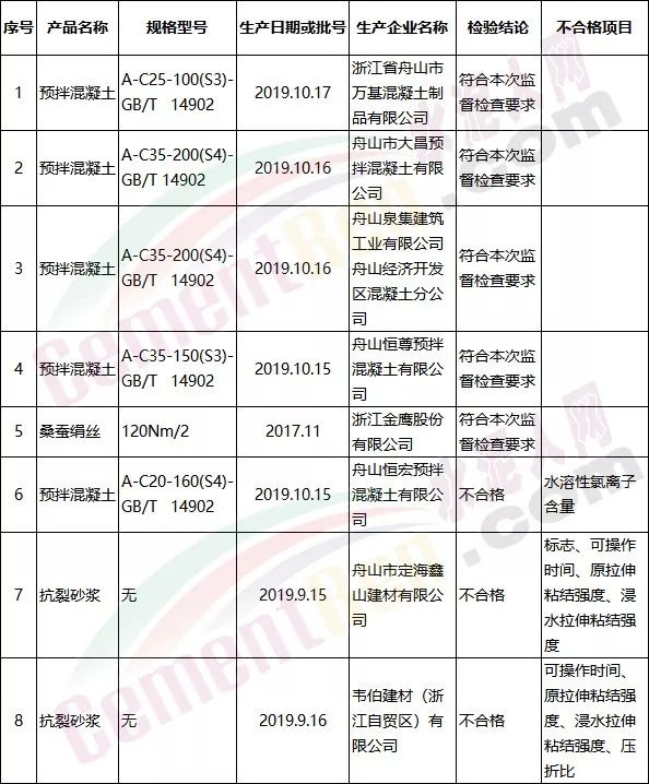 舟山恒宏预拌混凝土有限公司生产的1批次预拌混凝土(规格型号:A-C20-160(S4)-GB/T14902;生产日期或批号:2019.10.15)样品被检出水溶性氯离子含量项目不合格;