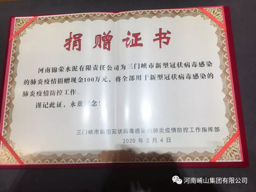 在抓好疫情防控工作的紧要关头,河南崤山集团所属企业河南锦荣水泥有限公司积极响应市委、市政府的号召,强化政治觉悟和责任担当,把疫情防控作为当前压倒一切的重大政治任务,积极抗击疫情。2月4日,锦荣公司向三门峡市新型冠状病毒感染的肺炎疫情防控工作指挥部捐款100万元,用于抗击疫情所需的各种紧急物资。