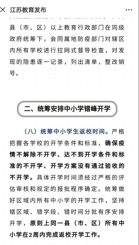 随即,江苏省教育厅发布了通知:原则上同一地县(市、区)所有中小学在两周内完成返校开学工作!