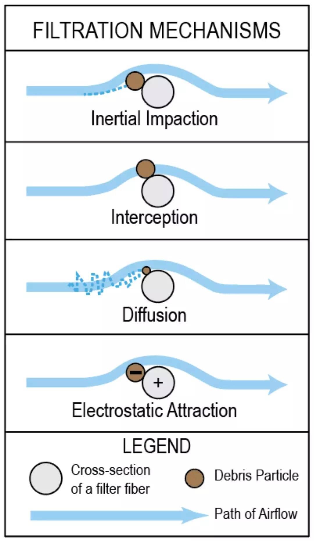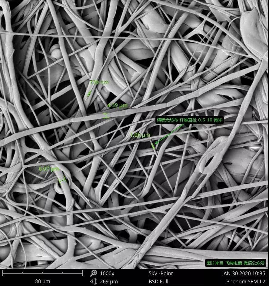 看到图片你们是不是会担忧,熔喷布空隙这么大,是怎么过滤环境中的病毒的呢?虽然新型冠状病毒尺寸很小,在 100 纳米(0.1微米)左右,但是病毒无法独立存在,其传播途径主要有分泌物和打喷嚏时的飞沫,飞沫的大小在 5 微米左右,这是其一,第二,熔喷布本质上是一种纤维过滤器,含有病毒的飞沫靠近熔喷布后,也会被静电吸附在表面,无法透过。