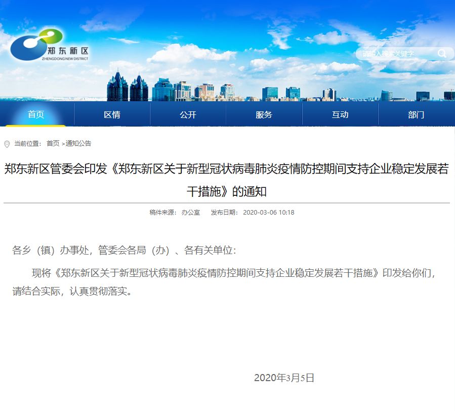 3月6日,河南省郑州市郑东新区管委会印发《郑东新区关于新型冠状病毒肺炎疫情防控期间支持企业稳定发展若干措施》的通知 。