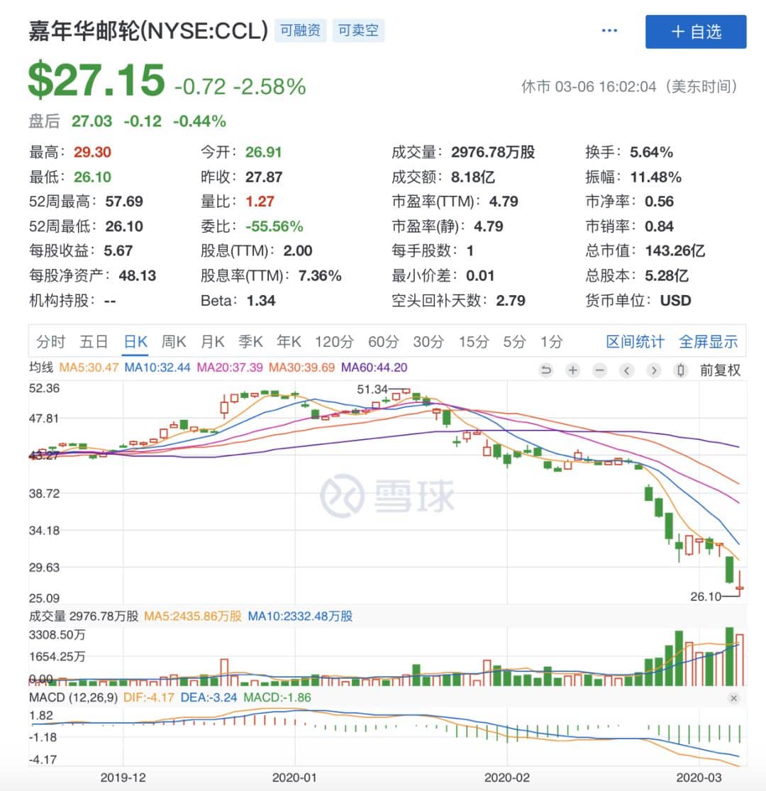 由于疫情爆发,嘉年华邮轮也暂停在1月25日-2月4日期间,取消了9条航线,并给乘客全额退款。这对于98%收入来源于船票和轮船上的服务业务的嘉年华邮轮公司来说,一季度的业绩已经遭受了部分损失,股价也因此不断下挫。