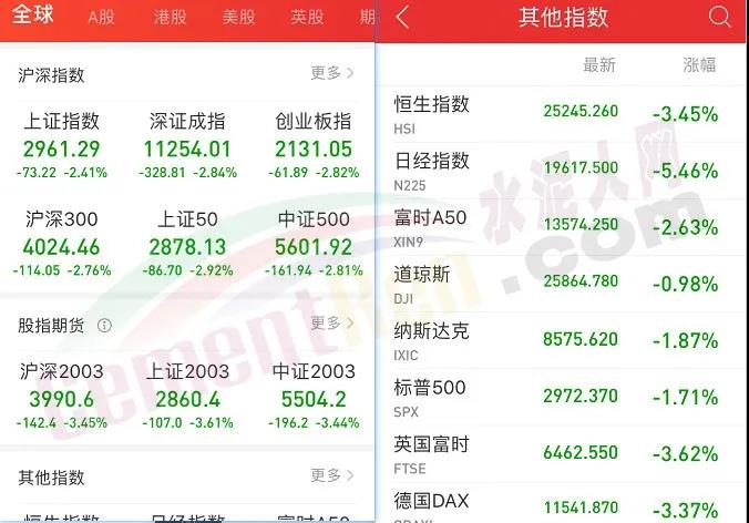 德国DAX指数跌7.4%,英国富时100指数跌8.6%,报5905.07点;法国CAC40指数跌7.7%,报4743.40点;意大利富时MIB指数跌10.7%,报18587.01点。