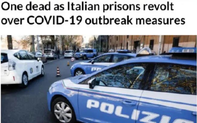 据环球网报道,意大利当地一家监狱人权组织当地时间8日表示,意大利4所监狱囚犯对该国控制新冠病毒疫情的新规定表示不满,发生暴动事件,并导致1名囚犯死亡。亚洲新闻台援引媒体报道称,类似的事件也在意大利北部的帕多瓦和南部的巴里、福贾和巴勒莫等地上演。