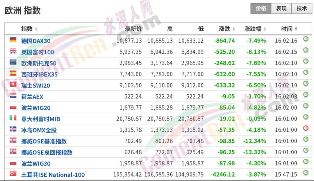 欧美股市也遭遇压力,欧洲股市开盘全线暴跌,德国DAX指数跌超7%;英国富时100跌超8%;盘前美股标普500、道琼斯30股指期货跌幅超4%。