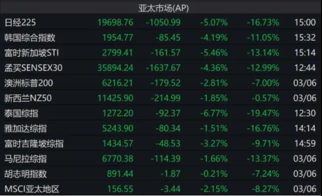 亚太股市方面,日经225指数大跌超5%以上,刷新2019年1月初以来低位。越南股市扩大跌幅至6.2%,创2001年10月以来最大跌幅。