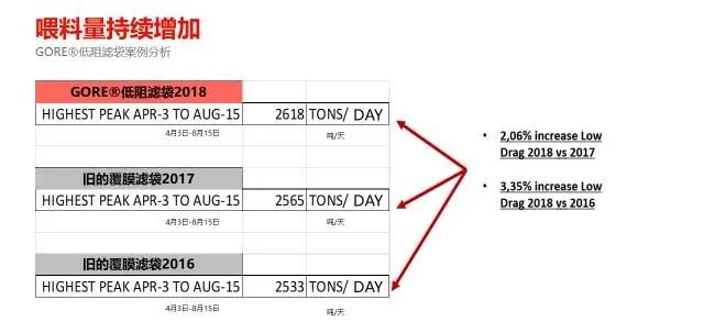 一共使用GORE®低阻滤袋2,856 条。持续记录分析风机转速、烟气流量、系统压差,并连续3年对产能及颗粒物排放数据进行对比分析:2016, 2017, 2018(4月3日至8月15日)。