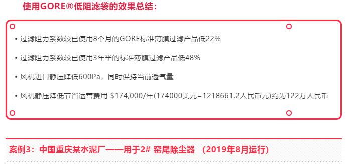 为适应国内水泥企业更高标准排放、更低能耗的发展要求,戈尔公司推出了全新的GORE®低阻滤袋。其采用戈尔第5代ePTFE低阻透气膜,极大地提高了颗粒物捕集效率,能够有效实现甚至超越5毫克超低排放标准。得益于最新的低阻膜技术,滤袋表面变得更加容易清灰,这让袋式除尘器获得了更低的压差,使其在使用期间能够获得更大风量,极大地降低风机的能耗。滤袋的使用寿命也得以延长,同时避免了额外的运营维护,最终实现总运营成本的降低。