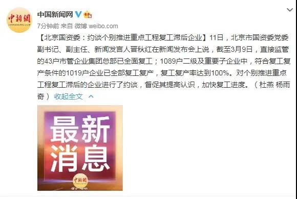 3月11日,北京市国资委党委副书记、副主任、新闻发言人晋秋红在新闻发布会上说,截至3月9日,直接监管的43户市管企业集团总部已全面复工;1089户二级及重要子企业中,符合复工复产条件的1019户企业已全部复工复产,复工复产率达到100%。对个别推进重点工程复工滞后的企业进行了约谈,督促其提高认识,加快复工进度。