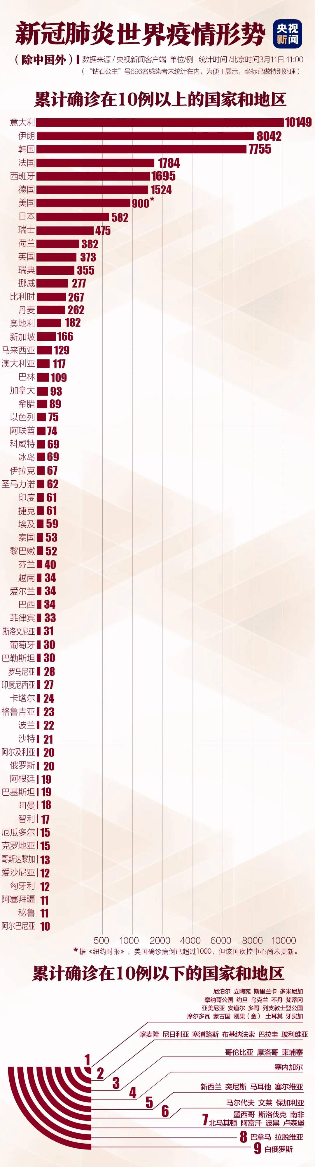 另据美国《纽约时报》报道,截至美东时间3月10日23时,全美新冠肺炎累计确诊病例超过1000例。