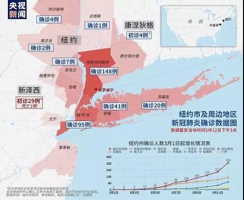 截至3月12日下午3点,纽约市新冠肺炎确诊人数已经逼近100人,而纽约州新冠肺炎确诊人数已经上升到了328人,仅次于华盛顿州。