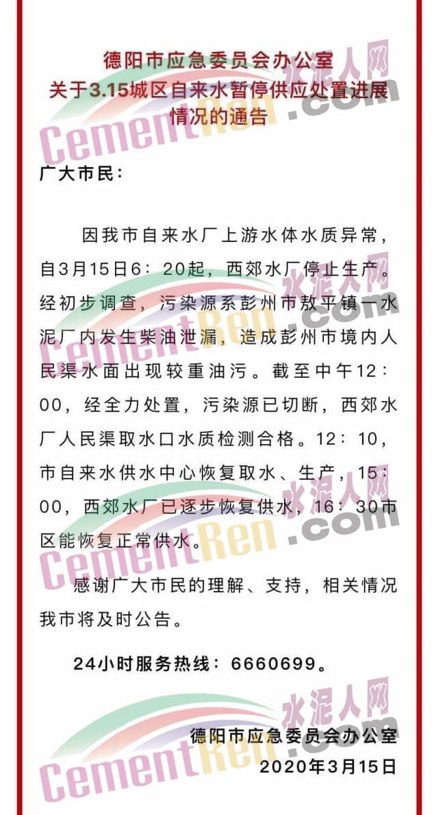 经过努力,3月15日12点10分,经连续监测,取水口水质达标,水厂恢复取水,15点城区逐步恢复供水,截止16点30分,市区恢复正常供水。