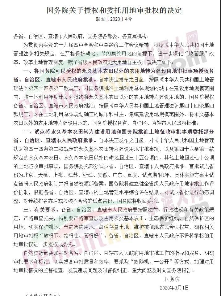 国务院日前印发《关于授权和委托用地审批权的决定》(以下简称《决定》)明确国务院可以授权的永久基本农田以外的农用地转为建设用地审批事项授权各省、自治区、直辖市人民政府批准。按照土地管理法第四十四条第三款规定,对国务院批准土地利用总体规划的城市在建设用地规模范围内,按土地利用年度计划分批次将永久基本农田以外的农用地转为建设用地的,国务院授权各省、自治区、直辖市人民政府批准;按照土地管理法第四十四条第四款规定,对在土地利用总体规划确定的城市和村庄、集镇建设用地规模范围外,将永久基本农田以外的农用地转为建设用地的,国务院授权各省、自治区、直辖市人民政府批准。