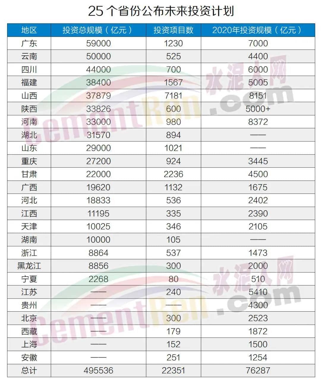 据不完全统计发现,截至3月10日,有25个省区市公布了未来的投资规划,2.2万个项目总投资额达49.6万亿元,其中2020年度计划投资总规模7.6万亿元。