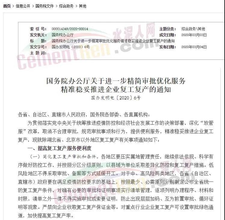 3月初,国务院办公厅发布《关于进一步精简审批优化服务精准稳妥推进企业复工复产的通知》(国办发明电〔2020〕6号)为贯彻落实党中央关于统筹推进疫情防控和经济社会发展工作的决策部署,深化“放管服”改革,取消不合理审批,规范审批事项和行为,提供便利服务,精准稳妥推进企业复工复产,全国工地建设复工将全面铺开,各省市不得设置障碍阻止复工。