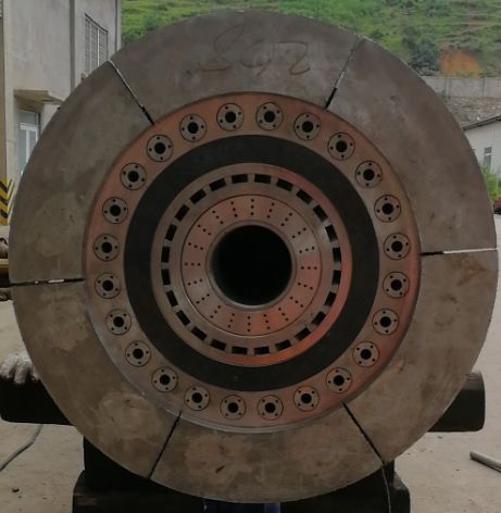 新改造的燃烧器头部为拉法基欧洲专供机型,此次定项设计RS项目窑头燃烧器头部尺寸改造,通过轴流风动能增加轴流风的推力率,以旋流风模式重新设计并修正气动角度,燃烧器头部改造后的直接效果,促使更大范围的高温烟气回流及内部气流的交换速率提升,提高着火能力,强化煅烧,有利于强度,密度,能耗,产量等多方面的优化改善,燃烧器头部结构也得到优化大幅延长使用周期。