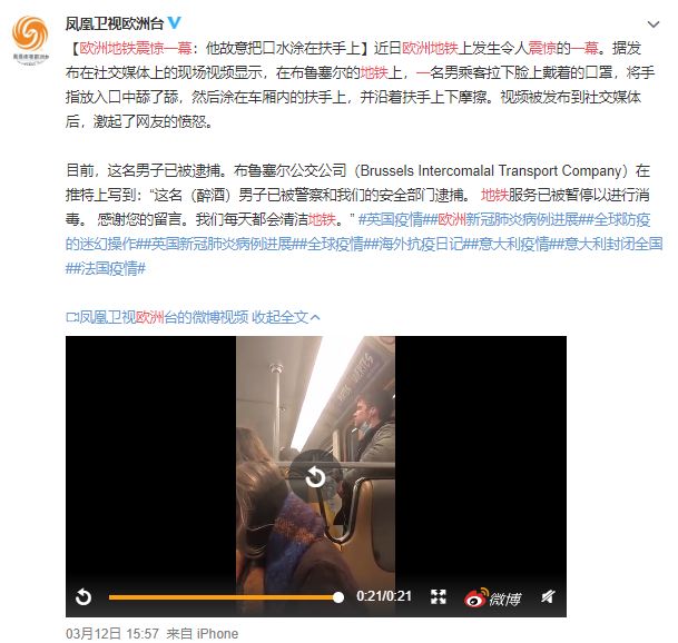 那么真实情况是这样的吗?小编认真了解了一下,发现视频中的事件真实存在,但事发地并不在中国,而是在欧洲。而且在3月12日,凤凰卫视欧洲台的官方微博(@凤凰卫视欧洲台)已对该事件进行过报道。这令人震惊的一幕发生在布鲁塞尔的地铁上。目前,这名男子已被捕。