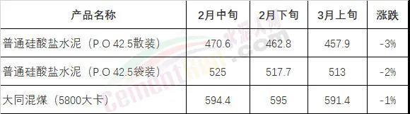 国家统计局流通领域重要生产资料市场价格变动情况显示自2月中旬开工以来,水泥及煤炭等价格下行。市场主流产品PO.42.5水泥均价跌幅在2%~3%。
