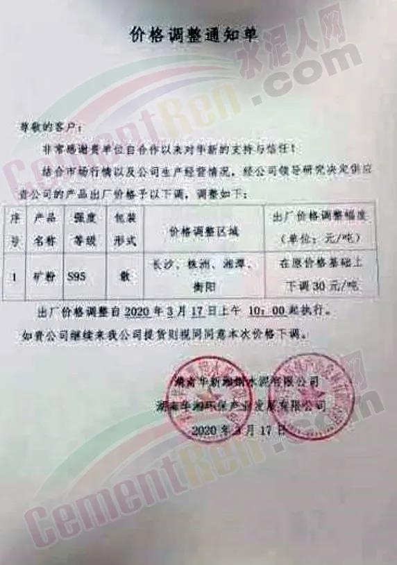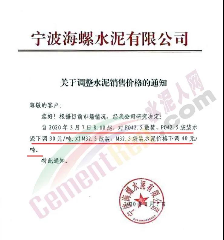 3月7日,浙江宁波主导企业通知,PO42.5散装、PO42.5袋装水泥下调30元/吨,M32.5散装、M32.5袋装水泥价格下调40元/吨。