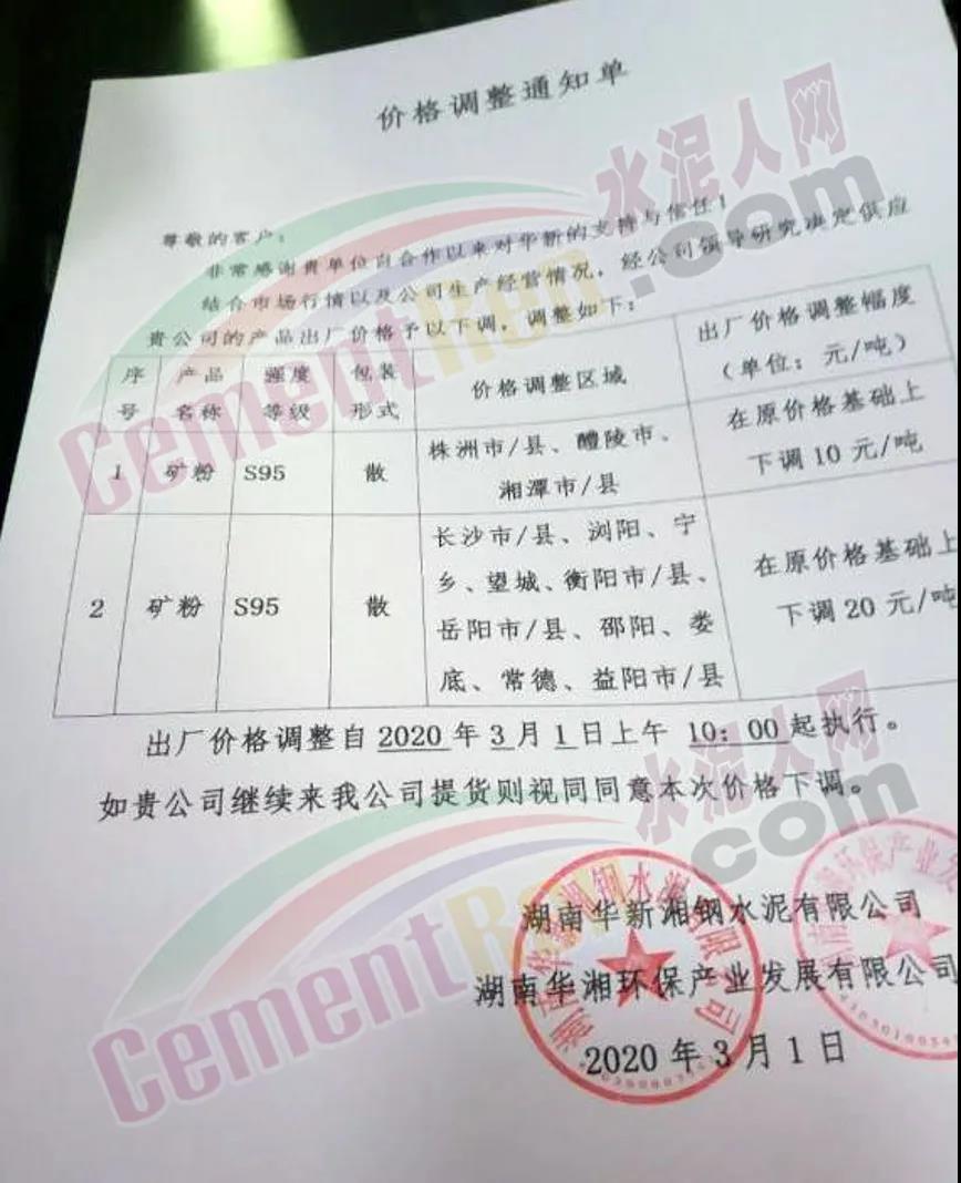 3月10日起湖南岳阳地区主要厂家陆续通知下调各品种水泥价格30元/吨。