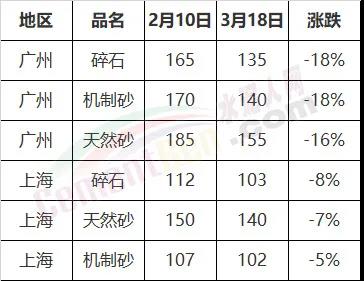 砂石方面,华南区域广州区域矿石、机制砂、天然砂跌幅达16~18%。上海市砂石价报价较2月中旬跌幅在5%以上。