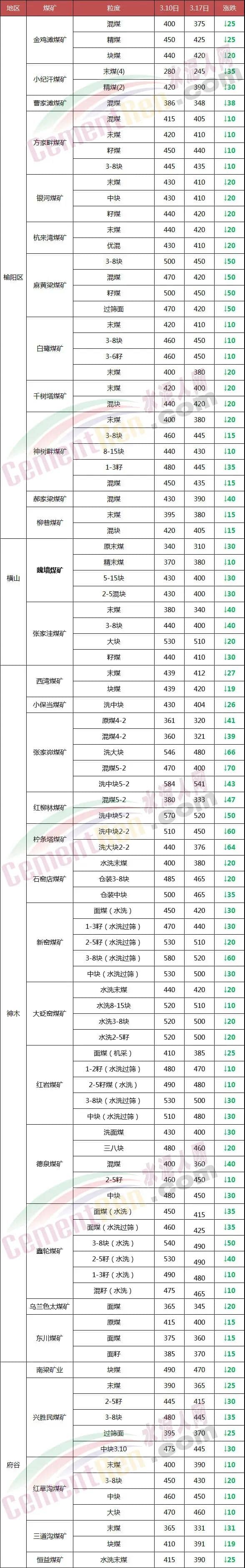 陕煤三大矿:3月17日进行本期竞价,个别煤种流标,大部分煤种价格下跌13-50 元/吨;